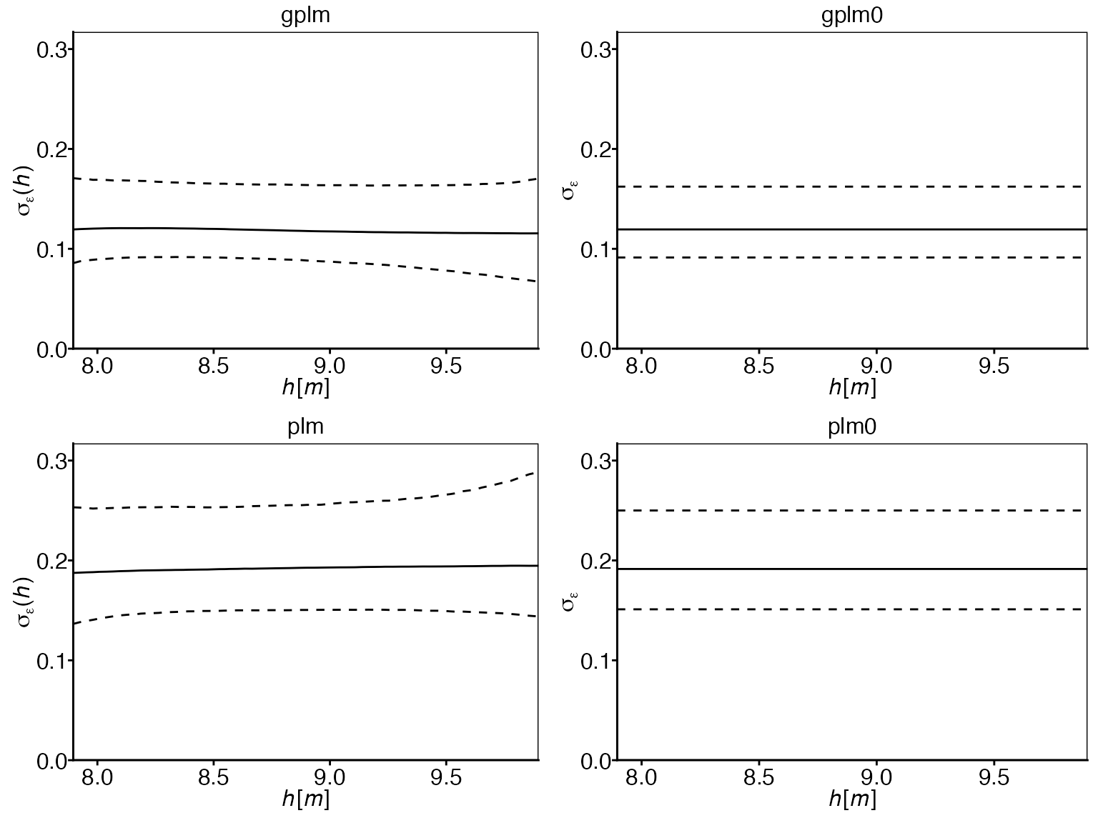 The differences between the four models lie in the treatment of the power-law exponent, , and the log-error standard deviation, , as either constants or stage-dependent functions. Therefore, it is insightful to examine the posterior distributions of these elements across the different models to determine whether stage dependence exists or if the assumption of constancy is appropriate.